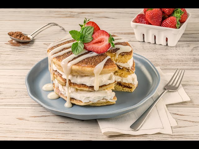 Moisten the pancakes with the coffee mixture. On a plate, place one pancake, add a layer of frosting, another pancake, and another layer of frosting. Garnish with NESTLÉ® LA LECHERA® Sweetened Condensed Milk Squeeze and cocoa powder. Enjoy.